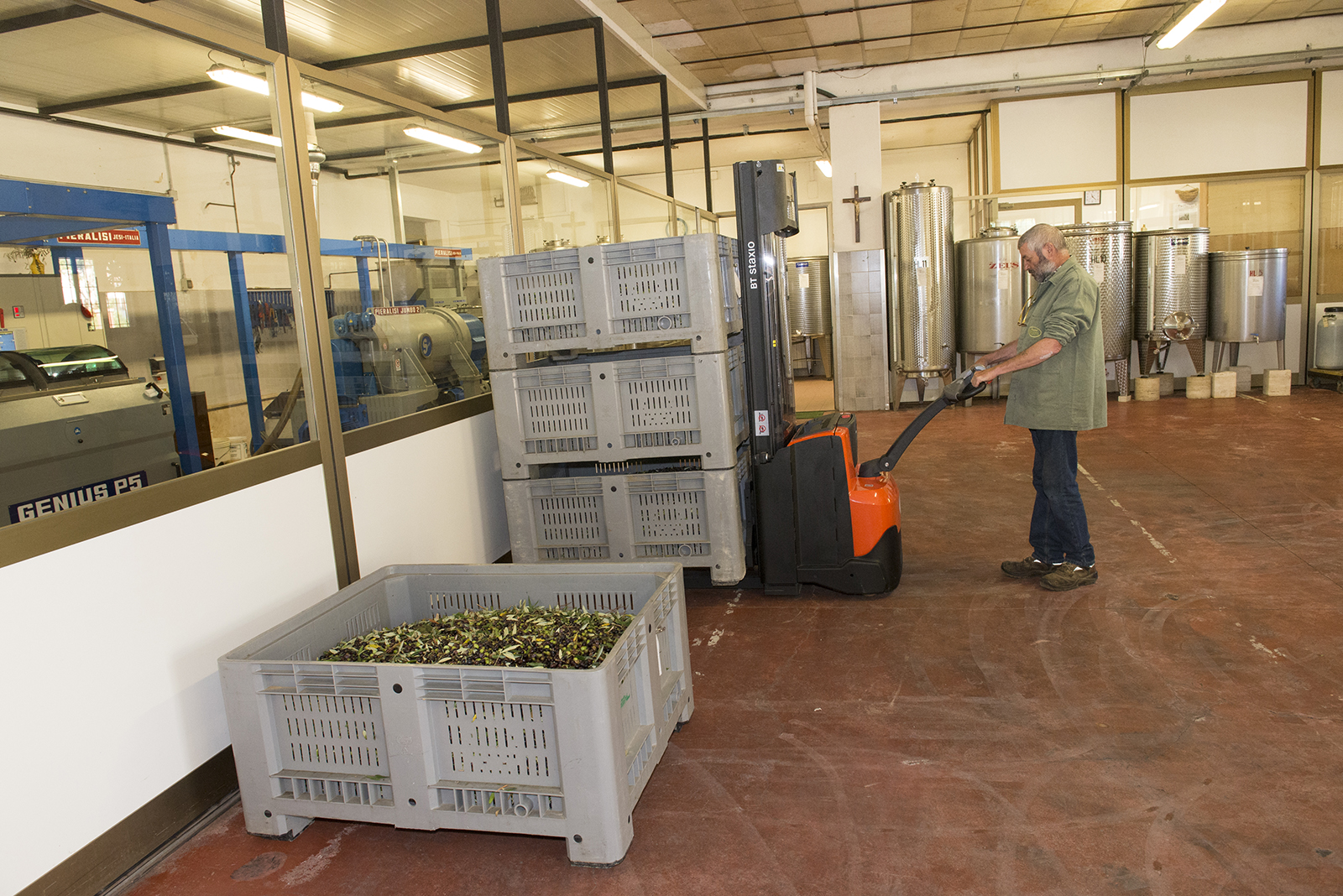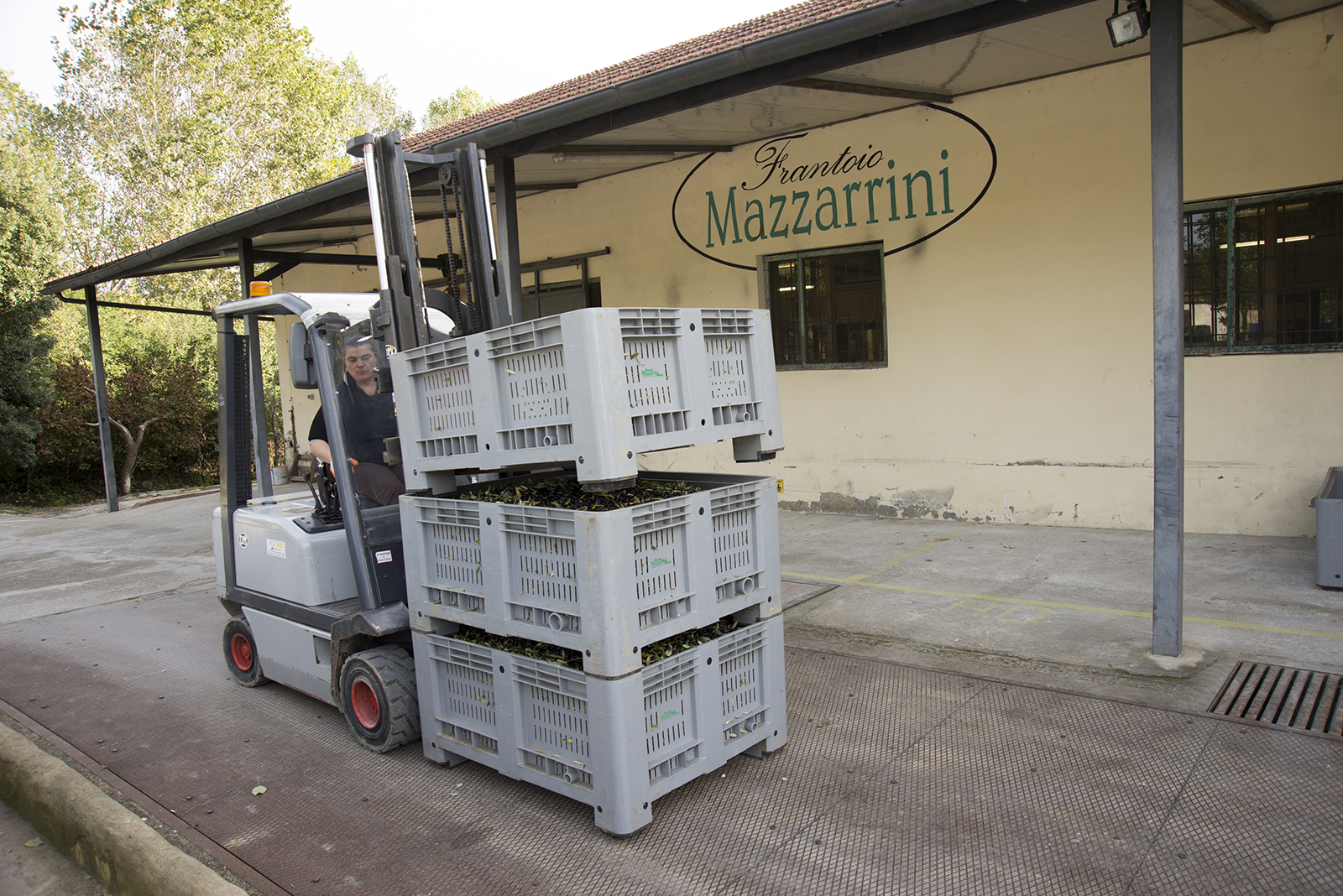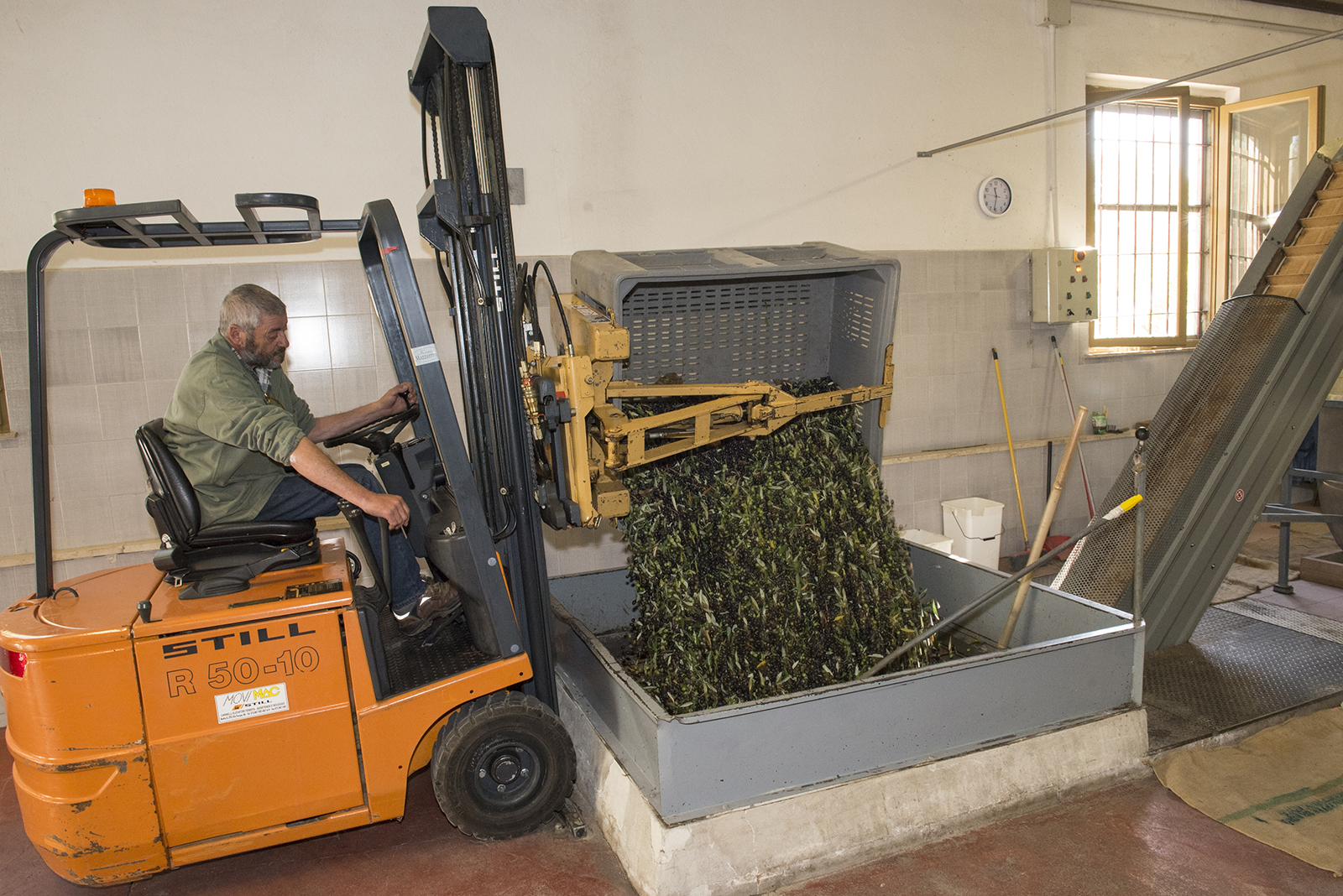 Come programma vuole, il muletto con forca rotante immette l’olive nel circuito d’estrazione, travasandole dai cassoni alla tramoggia. La tramoggia non è altro che una vasca ad imbuto.