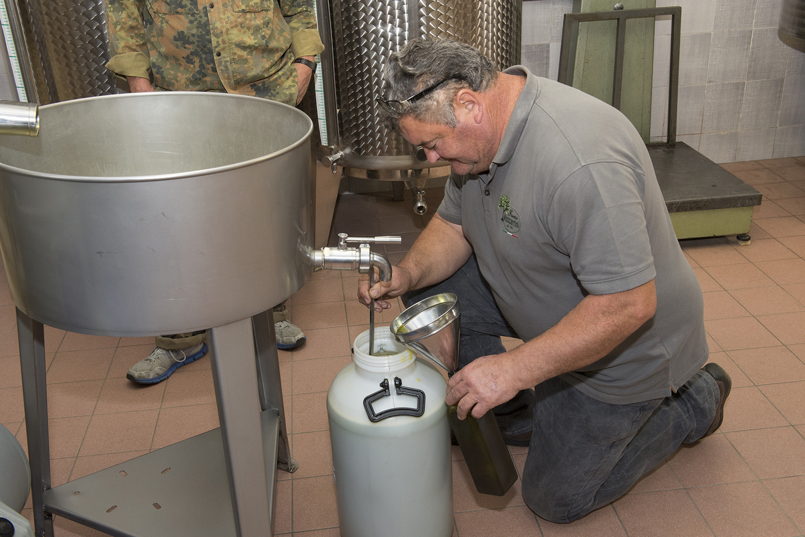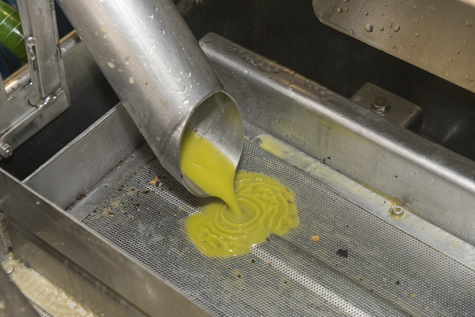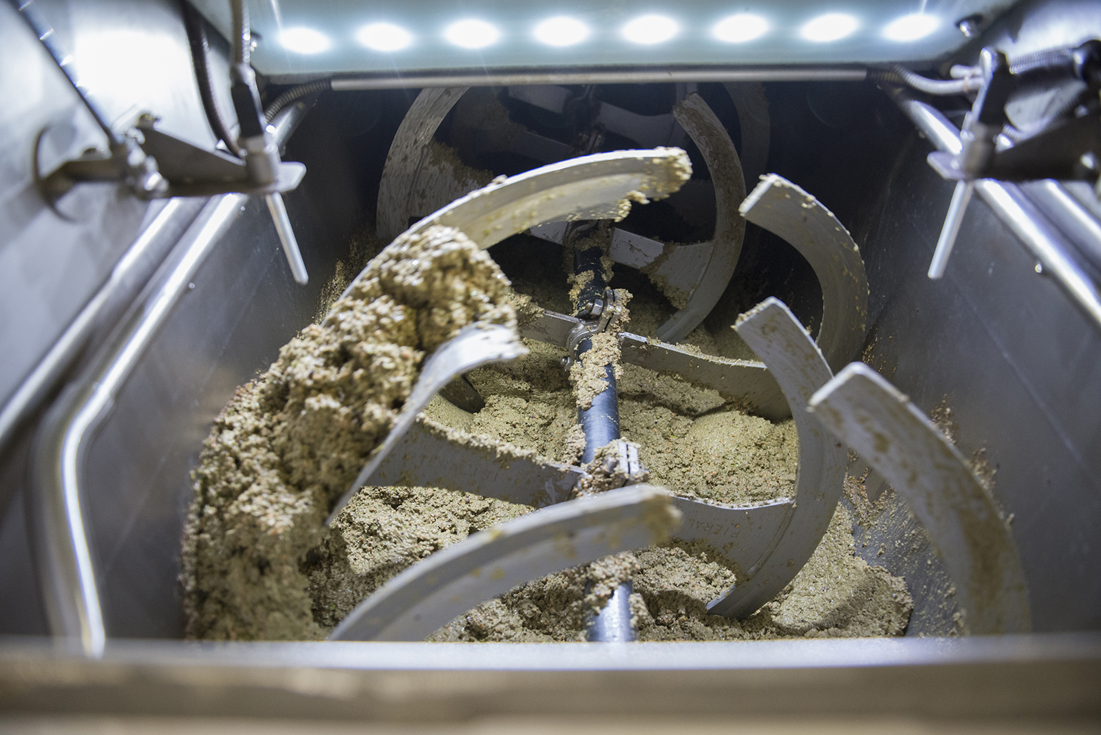Una volta che la pasta d’olive è uscita tutta si sciacqua velocemente, in modo tale da garantire l’individualità della lavorazione. La gramola non è altro che una vasca nella vasca, nella cui intercapedine circola acqua più o meno calda in modo tale che non vengano mai superati i 27°C, i quali, assieme al risciacquo effettuato a fine partita, sono indispensabili per fare qualsiasi tipo di certificazione.