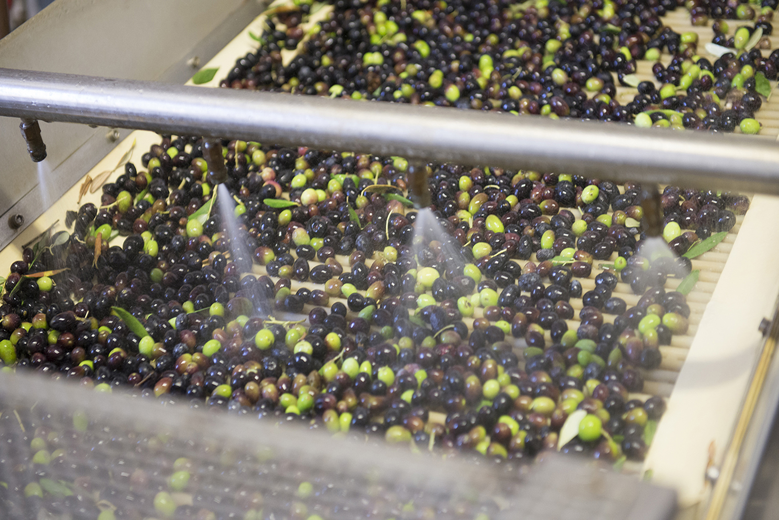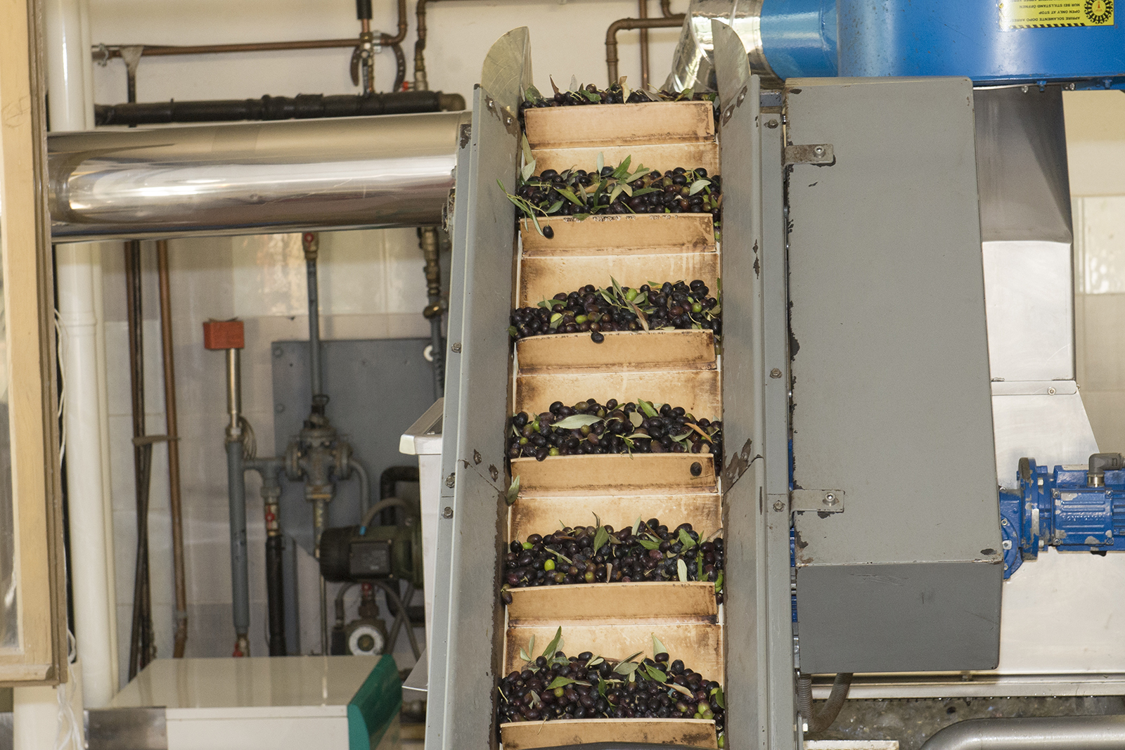 Il primo macchinario che s’avvia è il nastro trasportatore, il quale fa cadere l’olive, prima nel defogliatore e poi nella lavatrice. Il defogliatore soffia via tutto ciò che è più peso delle olive.
